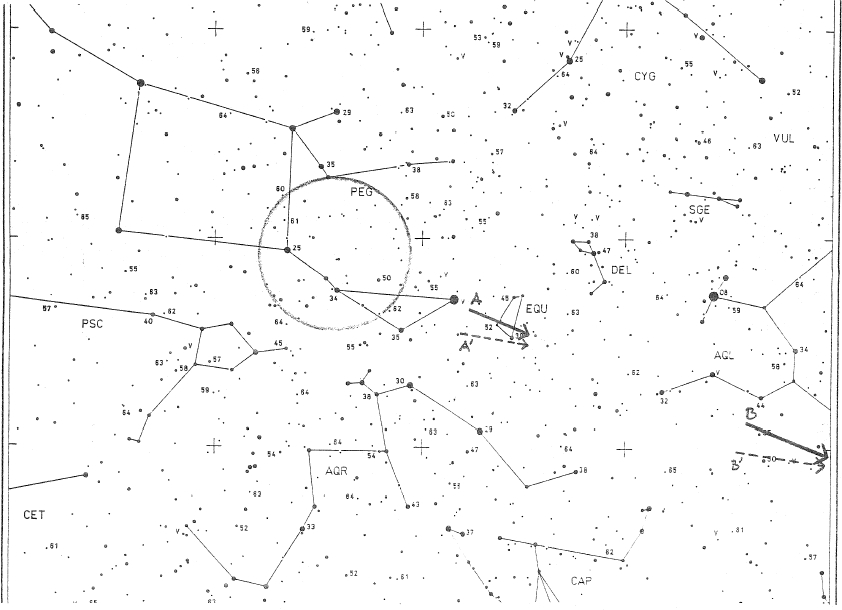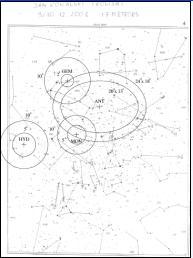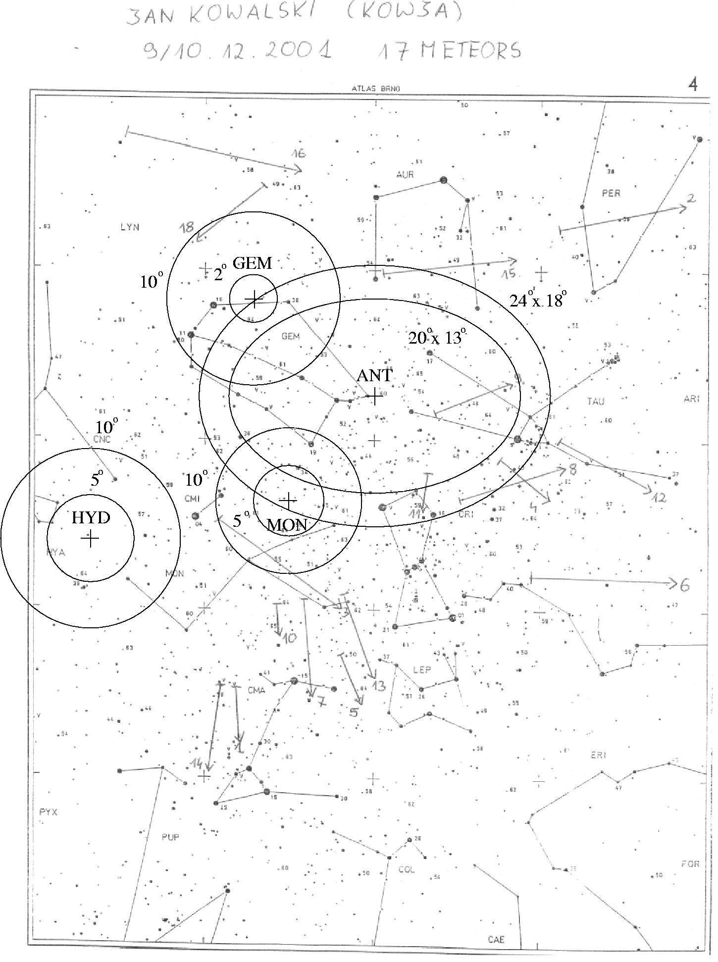 Rysunek nr.2: Mapa nr 4 z gnomicznego Atlasu Brno , na kótrej naszkicowano 17 meteorów zaobserwowanych podczas obserwacji wykonanej w nocy z 9 na 10 grudnia 2001roku. Środki okręgów lezą zawsze w centrum radiantu roju, a same okręgi mają promienie 2,5 lub 10 stopni. Dla Antyhelionu narysowano elipsy 20o x 13 o i 24 o x 18 o