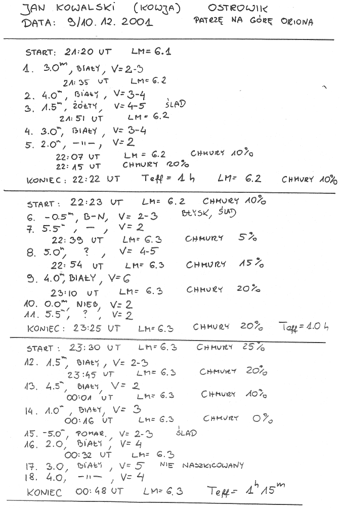 Gdy będziemy siedzieć już wygodnie, szczelnie opatuleni na naszym leżaku obserwacyjnym, zaadoptujemy wzrok do ciemności, pod ręką będziemy mieli nasze mapy, ołówek i dyktafon lub kawałek czystej kartki papieru, możemy rozpocząć obserwację. Po zanotowaniu czasu jej rozpoczęcia i początkowej widoczności granicznej LM zaczynamy wodzić powoli po niebie w okolicach wspomnianych wcześniej gwiazdozbiorów. W momencie zaobserwowania jakiegoś meteoru staramy się dokładnie zapamiętać jego trasę, a potem przenieść ją na odpowiednią mapę. Meteor rysujemy jako strzałkę podpisaną numerem. Zmierz czas jaki zajmuje naszkicowanie jednego zjawiska. Na dyktafonie (lub w notatniku) zapisz natomiast numer meteoru, jego jasność i prędkość w skali od 0 do 5 (Bardziej doświadczeni obserwatorzy mogą stosować skalę od 0 do 6, gdzie 6 oznacza meteor ekstremalnie szybki. Jeszcze bardziej zaawansowane osoby mogą rozszerzyć tą skalę do skali połówkowej. Więcej informacji na temat skali prędkości można znaleźć w rozdziale 2.3.). Nie trzeba podawać wysokości nad horyzontem, ponieważ informację tą można uzyskać z mapy, na której naszkicowaliśmy nasze meteory. Gdy minie godzina, przedłuż swoją obserwację, o taki okres czasu jaki zajęło Ci naszkicowanie wszystkich zjawisk, tak aby efektywny czas Twojej obserwacji wynosił pełną godzinę. Po wykonaniu tych czynności możesz rozpocząć następną godzinę obserwacji. Należy przy tym zachować numerację meteorów tzn. gdy w poprzedniej godzinie odnotowaliśmy np. osiem meteorów, pierwszy meteor w drugiej godzinie powinien mieć numer 9.